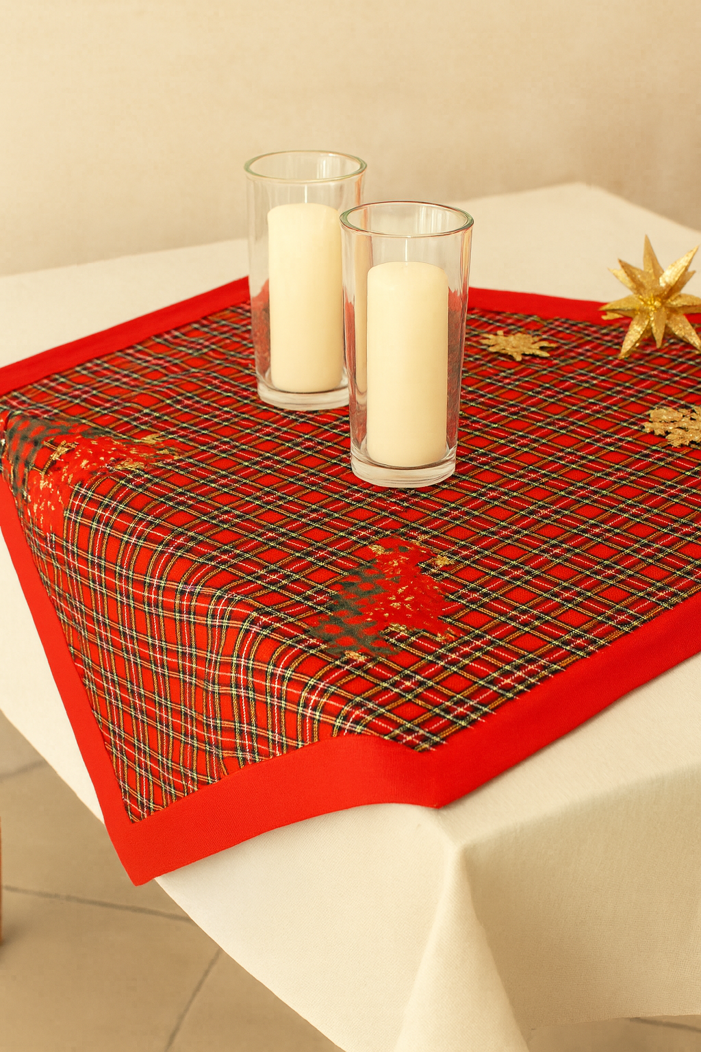 Abbina questo centrotavola con runner e tovaglia in tinta unita (bianco o crema) per far risaltare il motivo tartan. Completa l’allestimento con candele in vetro trasparente e piccoli decori metallici per un tocco chic.