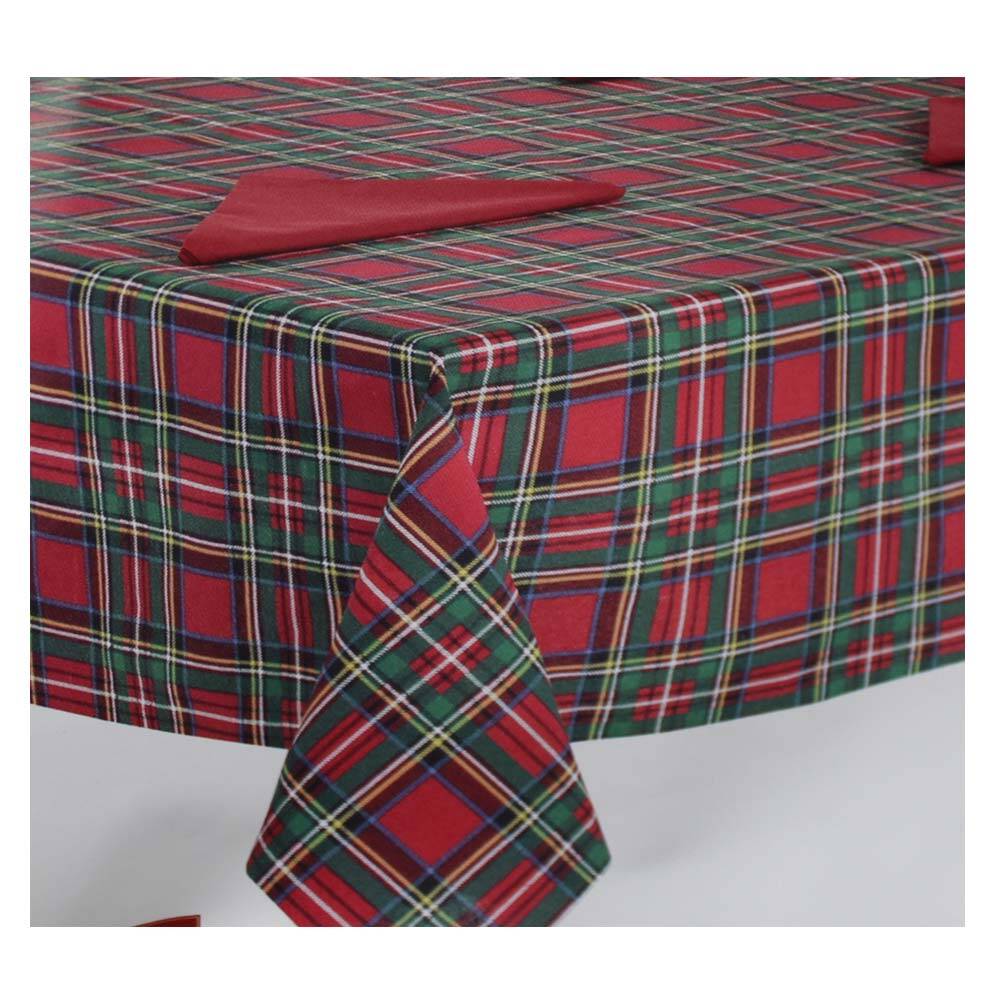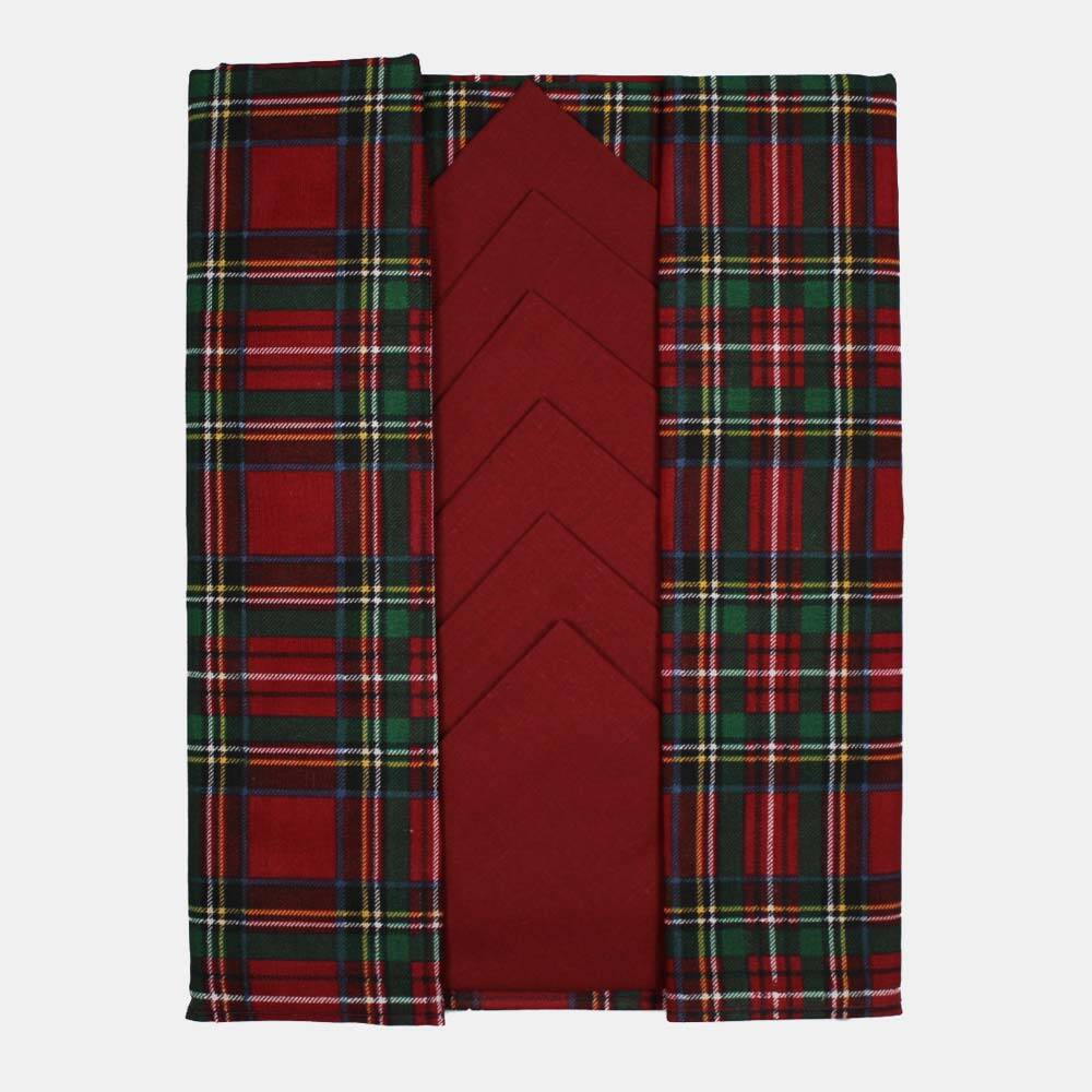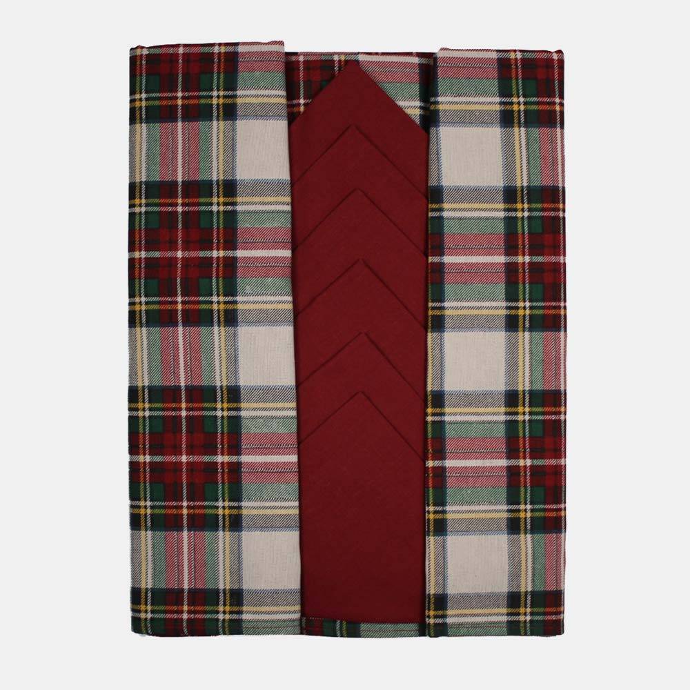 Servizio in cotone, tovaglia realizzata con stampa tartan, tovaglioli tinta unica rossi.