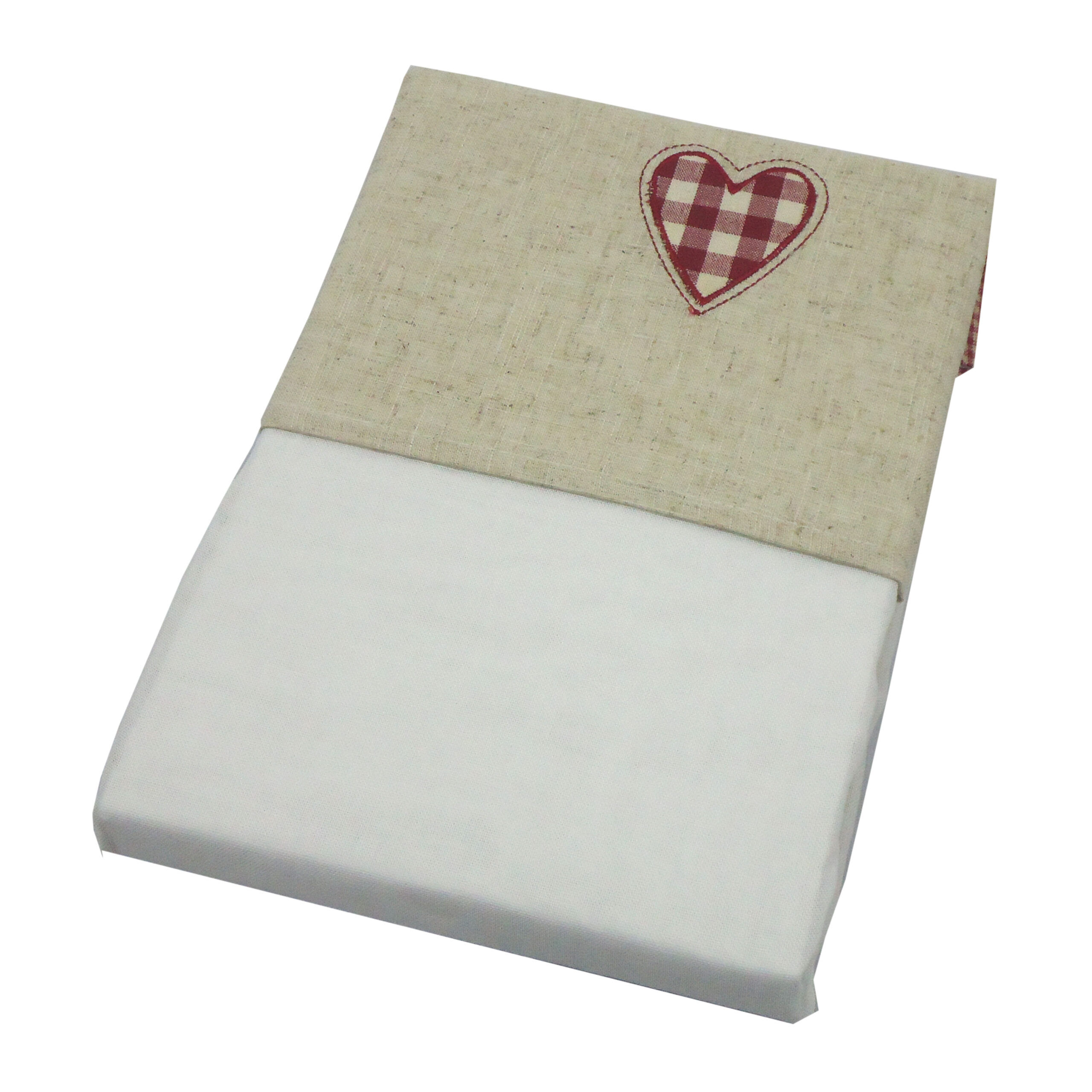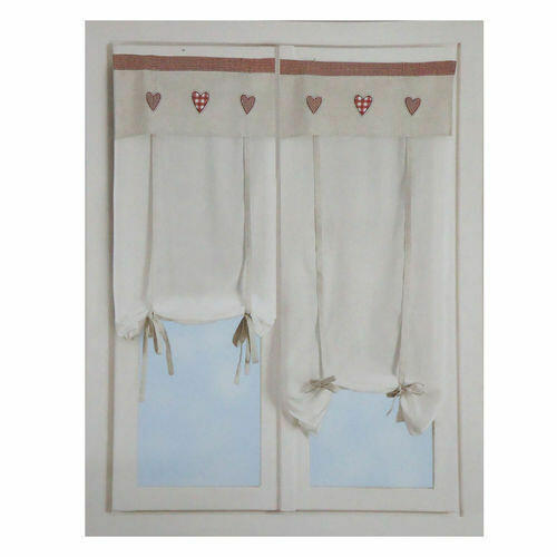 Coppia tendine regolabili realizzata in poliestere 100%. Tessuto di base in tessuto bianco, balza color lino con motivo a cuori ricamato.